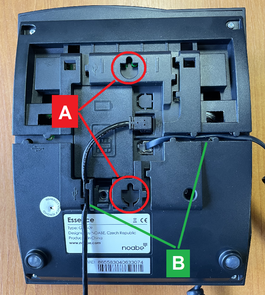 Two suitable screws with a flat head should be used for fitting the Essence on a wall. Screws should be screwed into the wall first, then Essence is hanged on screws using the mounting holes (A). The power cable and the handset cord should be secured by pushing it into dedicated grooves (B).