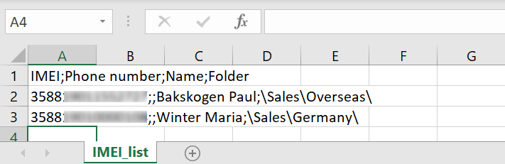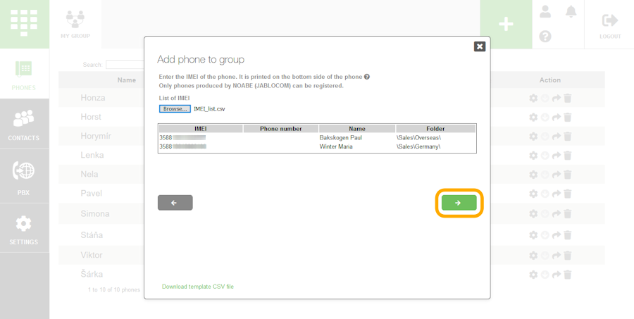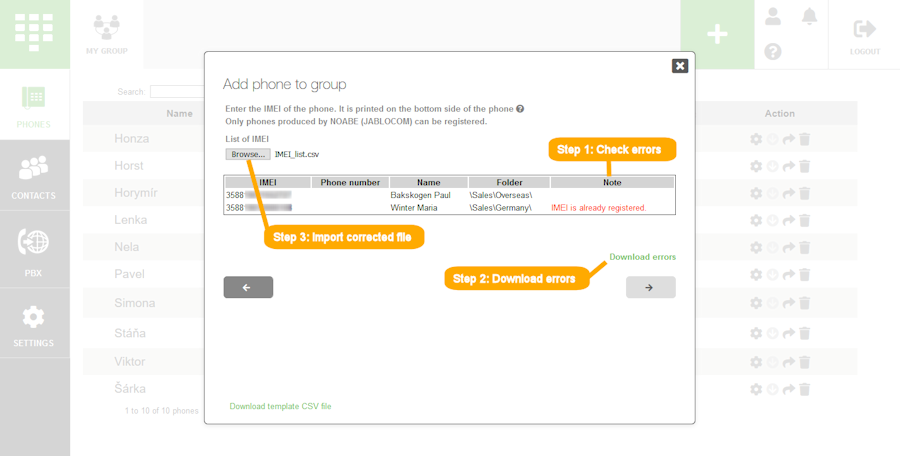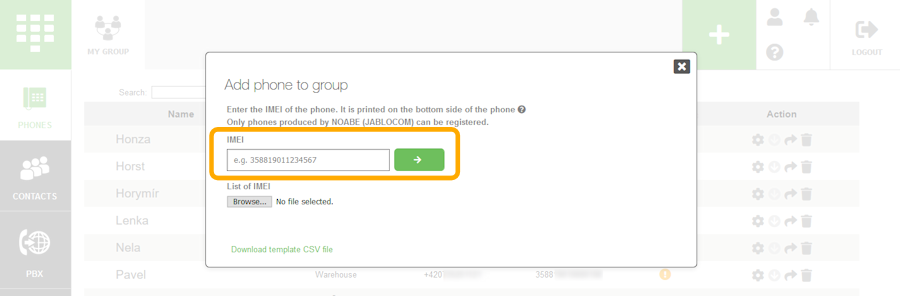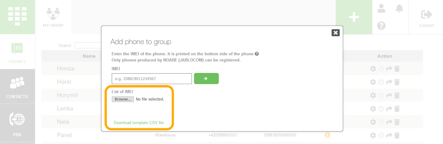 - Download the template (https://www.jablotool.com/img/IMEI_list.csv) and prepare the import list of phones. Only the IMEI numbers are required, all other values are voluntary. Phone numbers will be filled automatically** and other values can be entered later.