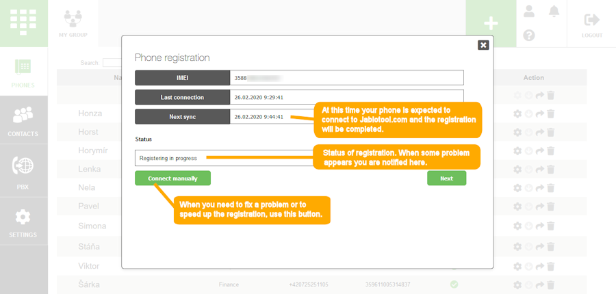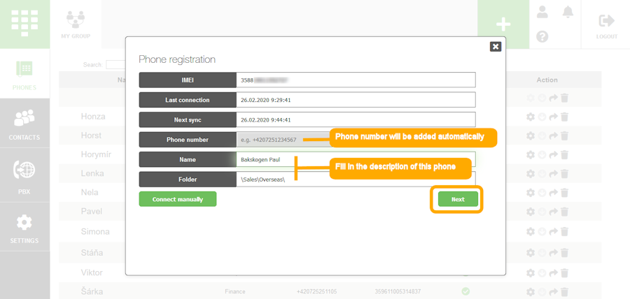 Registration of phone to your account is based on its IMEI number (unique serial number). You can either add phone-by-phone or you can import list of your phones. Both methods are described bellow.
