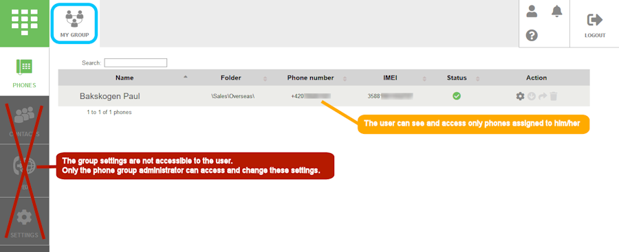 In the user’s dashboard the phone group can be seen. When phone group is opened, only those phones assigned to this user can be seen and can be accessed. The group settings (in the left vertical menu) are not accessible to the user. Those settings can be accessed only by the phone group administrator.
