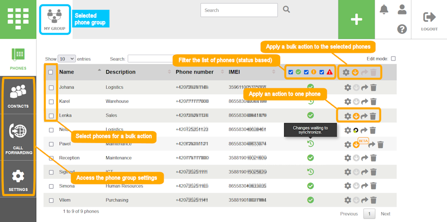 In the Status column you can see current statuses of all phones. When some problem appears, the orange exclamation mark is displayed. When you hold a pointer on it, you will see details.