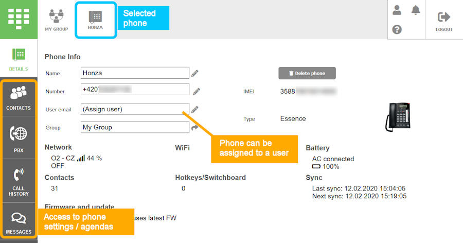 Phone detail provides detailed information about each phone. It is also the starting point for individual setting of the particular phone (all agendas can be accessed from the left vertical menu). Name of the currently opened phone can be found in the upper horizontal menu.
