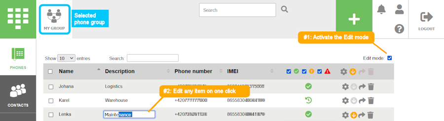 Agenda Phones offers overview of all phones in your phone group. Name of the currently opened phone group can be found in the upper horizontal menu (here you can always see “where you are” – which agenda in which context is opened).