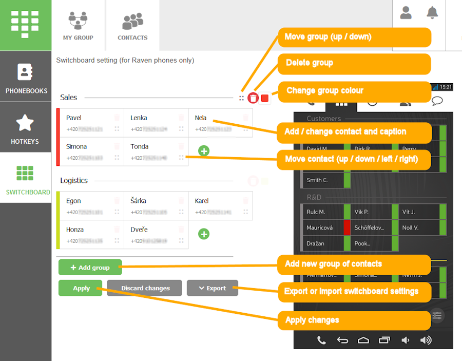 Select phone group > Click Contacts in the left vertical menu > Click Switchboard in the left vertical menu - Individual items. These items are administered by the phone group administrator, by assigned user, or directly on the phone. They are synchronized to one particular phone only.