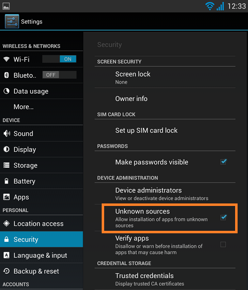 Settings > Security > Unknown resources