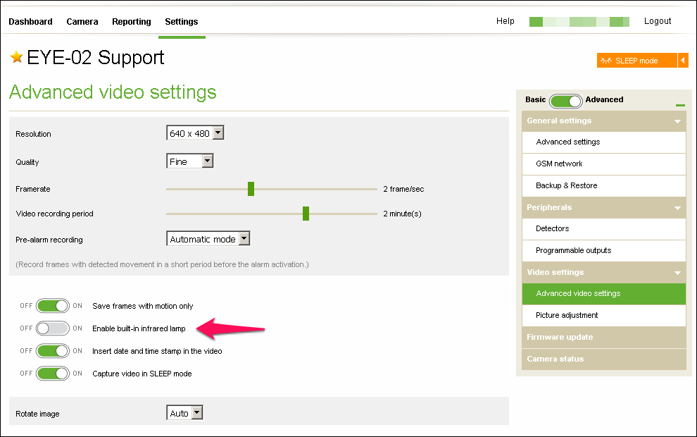 We suggest switching off the internal IR illumination when an external IR lamp is used. Connect to the camera in www.jablotool.com and select Settings (Advanced) > Advanced video settings
