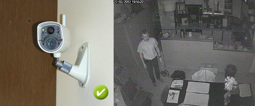 You can see a correct orientation on the following picture. The best result is obtained when the camera is rotated by 45° from the wall. Thanks to the 95° viewing angle it covers the whole space and the reflection is acceptable.