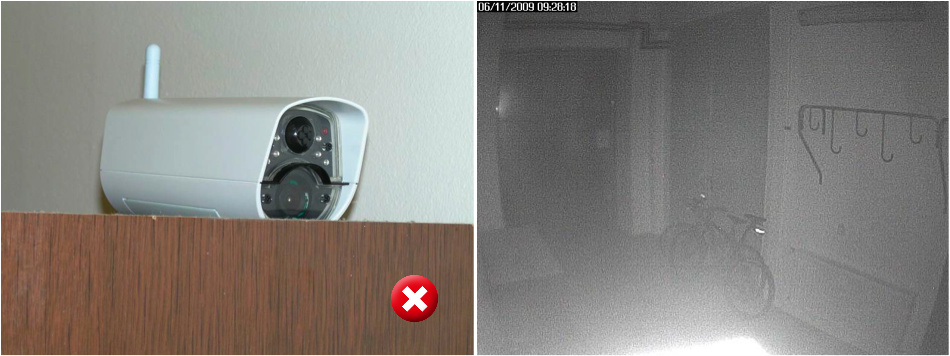- Make sure that no object illuminated by the IR lamp reflects IR beams from the lamp directly to the camera lens. In such case you need to find a different orientation of the lamp.